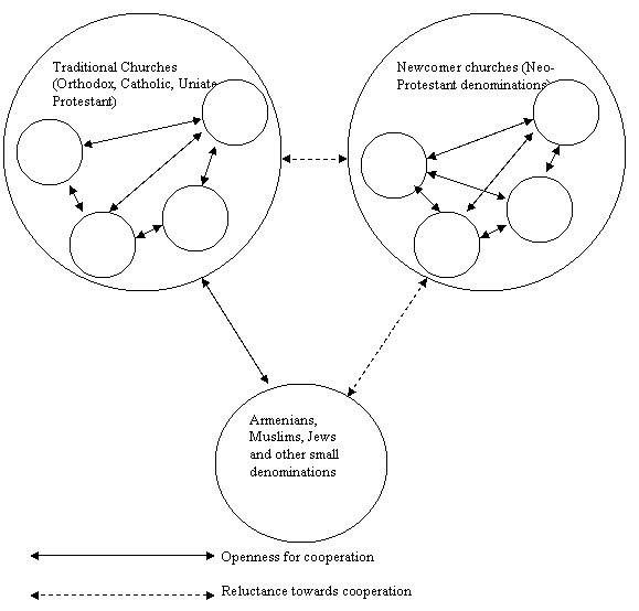 JSRI No.12 /Winter 2005 p . 93 Inter-denominational cooperation tends to be more present inside the same "historical group" of churches. Being considered a member of the category with the same general label increases the chances of openness for cooperation with other members of the same group. In the same time, inter-group cooperation tends to be less when considering the traditional vs. new denominational dichotomy. If a certain group of churches is considered to act as a clear competitor in the religious/theological field, then its "members" tend to be regarded as unfit for cooperation, thus affecting the general framework favorable for inter-denominational cooperation. Non-competitive groups will be accepted for cooperation mainly because they are not perceived as a threat to the status-quo. There is an exception to this: mainly because of the historical factors and individual clergy reticence toward solving the dispute between the Orthodox and the Uniate Churches, the propensity for cooperation between these two churches is low event at the level of church-based NGOs. Public support for cooperation. Attitudes towards church-state relation and inter-denominational relations In May 2004 I conducted an opinion poll with the help of Bogdan Voicu and the Center for Political Studies and Analysis, the Romanian Society of Political Science. The sample comprised 385 respondents with a margin of error of 5%. A national panel survey was organized in November and December 2004 in collaboration with Marina Popescu from the University of Essex, Gabriel Badescu from Babes-Bolyai University, and Grigore Pop-Eleches from Princeton University. The margin of error of the sample was 3% with a total of 3310 respondents for the two surveys. The results of the survey in Bucharest revealed