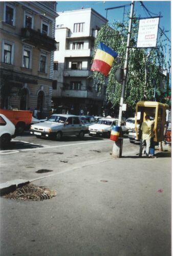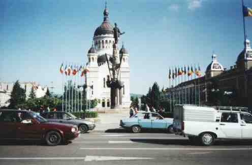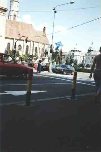 1. Steaguri Intr-o dupa-amiaza, stind in autobuzul oprit la stop, am numarat mai mult de 40 de steaguri tricolore in piata care inconjoara Catedrala Ortodoxa (douazeci pot fi numarate doar in poza nr.1, incadrind statuia lui Avram Iancu). Bietul Pristanda ar fi dat cu siguranta faliment. Cert este ca steagurile se vad inca din tren, inainte de intrarea in Cluj. Strazile principale ale orasului sint flancate, din stilp in stilp, de cite o pereche de steaguri. Cladirile principale arboreaza la rindul lor steaguri. Cele doua centre simbolice" ale orasului - Catedrala Ortodoxa si Biserica Sf. Mihail sint JSRI No. 2/Summer 2002 p.152 literalmente inconjurate de steaguri (lucru ciudat, la un moment dat, prin aprilie 2002, la Catedrala Ortodoxa aparusera steagurile albastre cu stelute aurii ale Uniunii Europene, strajuind fratern flamurile nationale. Acum, o parte s-au mutat pe colt la Hotelul Continental - vezi poza nr.6). Orice calcul aproximativ este descurajant. 2. Fanioane tricolore. Filfiie gratios in fata Bisericii Sfintului Mihail (poza nr.7).