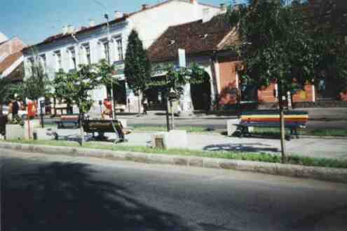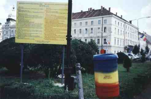 9. Panouri tricolore. In fata rezervatiei arheologice" din Piata Unirii, un panou galben explica, in rosu si albastru, motivele sapaturilor (in romana si engleza) (poza nr.8). JSRI No. 2/Summer 2002 p.153 De acelasi tip sint si panourile montate cu extrase din Constitutia Romaniei. De exemplu, pe str. Memorandumului. 10. Baraci, tarabe tricolore. O baraca se afla in piata Cipariu; de la ea se vind oua. O taraba de flori este pe strada Motilor, iar una de ziare in Piata Mihai Viteazul.